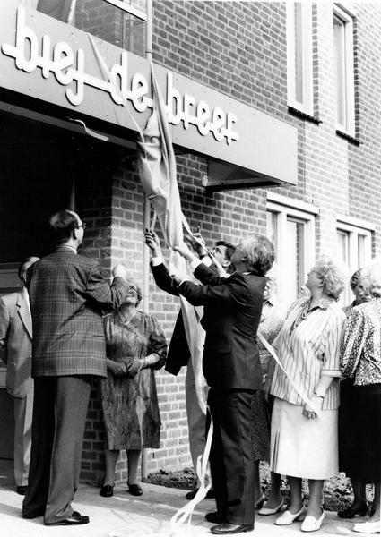 Niet alleen de genodigden, maar ook een groot aantal bewoners van de bejaardenflat aan de Broeklaan, kijken belangstellend toe hoe de heer Broekke, plaatsvervangend hoofdingenieur directeur van de Volkshuisvesting in Limburg de naam van de flat onthult.