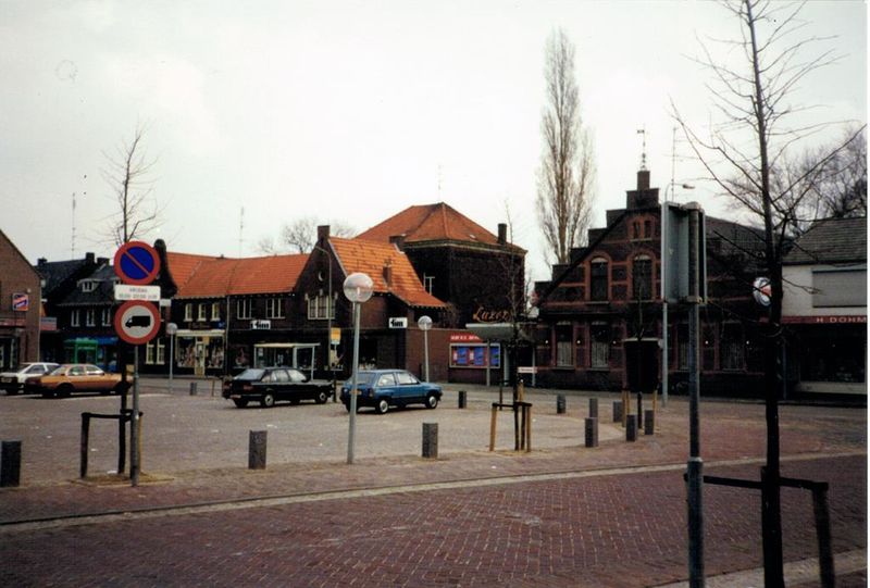 Van links naar rechts, drogisterij Cremers, boekhandel Tim, bioscoop Luxor en tankstation annex winkel Dohmen.