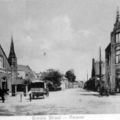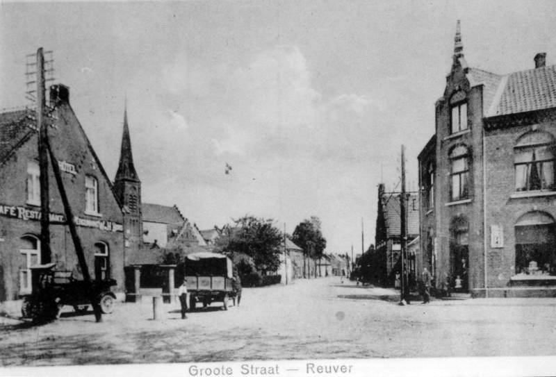 De kruising Rijksweg (toen nog Groote straat) - Stationsstraat te Reuver met links café-restaurant Bors. Rechts de winkel van Vossen Bär.
