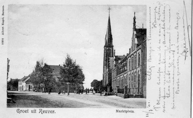 Prentbriefkaart met hierop de Rijksweg in Reuver met het oude marktplein voor het raadhuis.