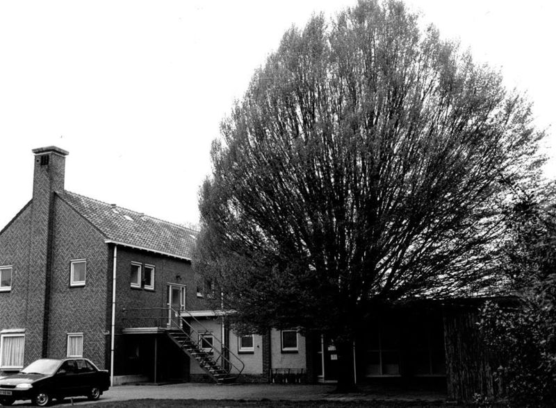 De achterzijde van het Groene Kruisgebouw met een mooie haagbeuk.