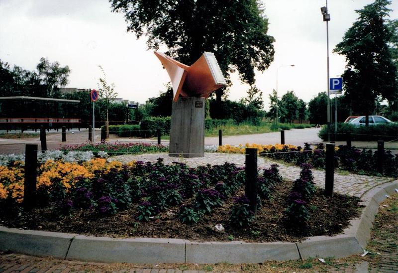 Het kunstwerk op de rotonde voor het station. Het werd geplaatst in 1995 ter herinnering aan 50 jaar bevrijding.