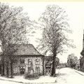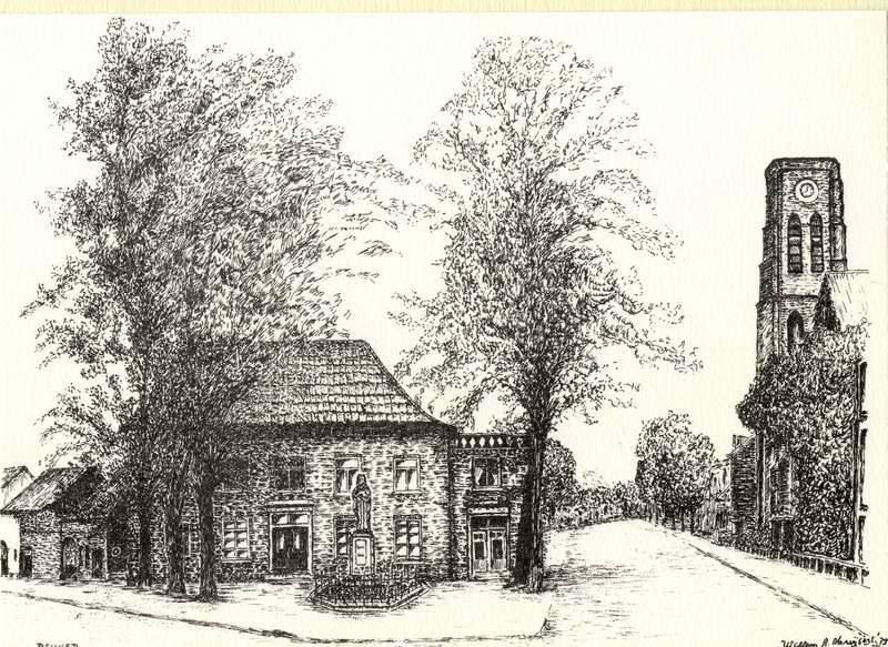Pentekening van het Raadhuis en kerk te Reuver zoals deze eruit zagen in 1950. De pentekening is gemaakt in 1979 t.g.v. de opening van de Amro-bank aan de Past. Vranckenlaan 40 te Reuver.