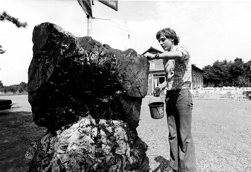 In 1975 werd de witte steen bij café "De Witte Sjtein" 's-nachts zwart geverfd. Op de foto is men bezig met het schoonmaken van de steen.