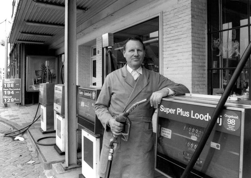Eduard Dohmen voor zijn winkel en tankstation.