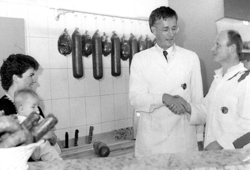 Bij de opening van hun nieuwe slagerij werden Pieter en Annemarie Franssen - Welten gefeliciteerd door burgemeester Nuytens.