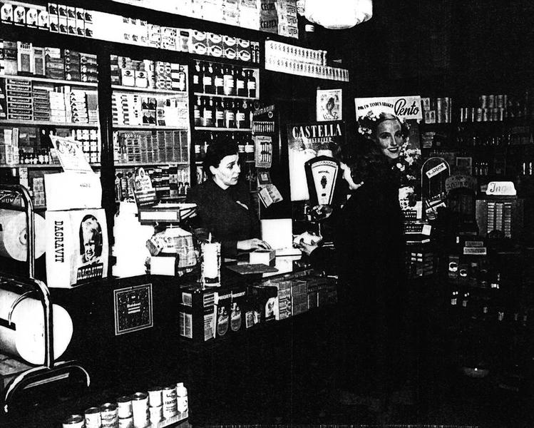 Drogisterij Cremers met mevrouw Cremers achter de toonbank.