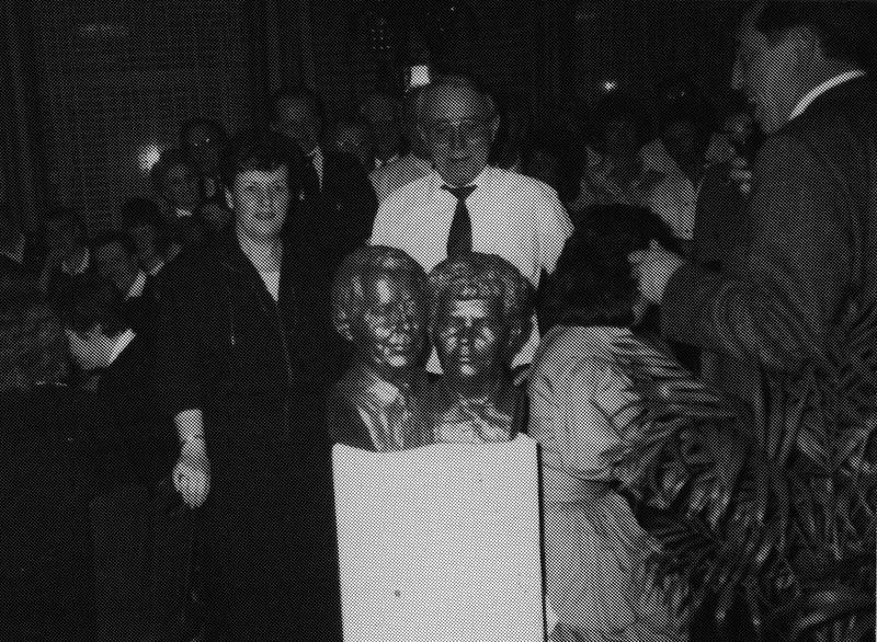 Mia en Frits Niemans gefotografeerd achter hun evenbeelden uisteren naar een toespraak van Sjra op het Veld bij gelegenheid van hun afscheid van café "De Grens"