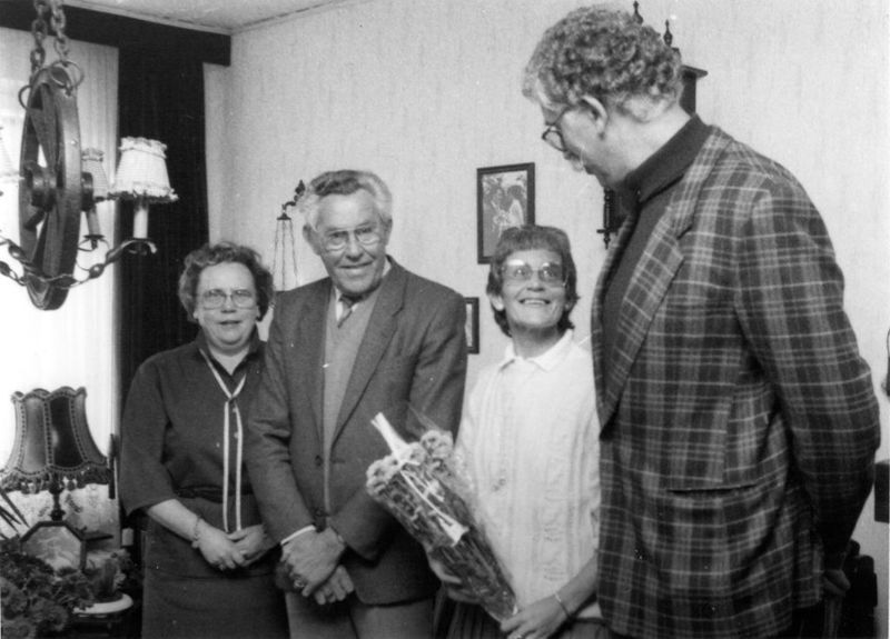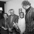 op de foto krijgen Sjaak Gommans (tweede van links) en Mia Hermans bloemen van Gerrie Dohmen - Paar en Huub Timmermans namens de middenstand van Reuver.