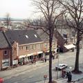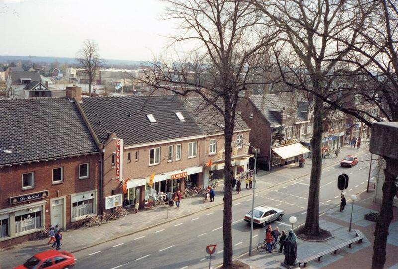 De Rijksweg in het centrum van Reuver met links café - zaal "De Patriot" en daarnaast Blokker. De foto is genomen vanuit de bovenste etage van het klooster.