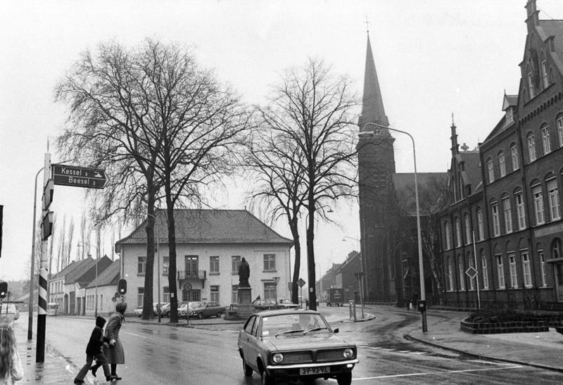 De Rijksweg en de Pastoor Vranckenlaan in Reuver met uitzicht op het oude gemeentehuis, het H.Hart klooster en de St.Lambertuskerk.