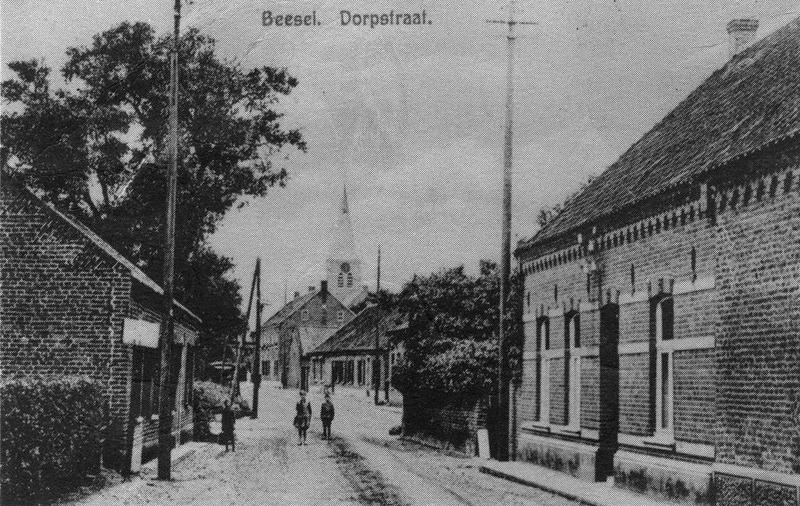 De Monseigneur Theelenstraat in vroegere tijden. Op de achtergrond de kerk van Beesel.