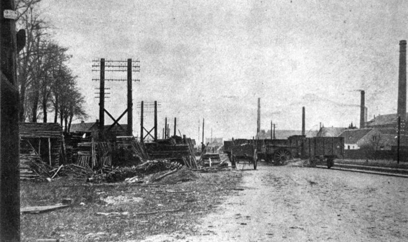 Het stationsemplacement in Reuver in 1929. Op de achtergrond de fabrieksschoorstenen van de grewarenfabrieken van Teeuwen en Janssen-Willemsen. In het lage witte huis (rechts op de foto) was het eerste postkantoor van Reuver gevestigd.