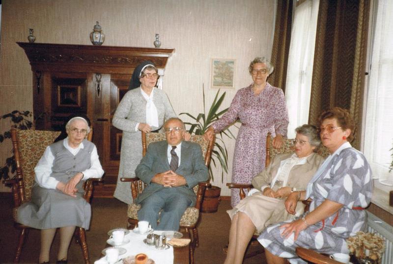 Theo Pinkowitz was een van de Joodse vluchtelingen uit Duitsland, die tijdens de Tweede Wereldoorlog in het H.Hart klooster verbleef. Samen met zijn vrouw Myra (zittend rechts naast hem) bezocht hij in 1984 het klooster en een aantal van de nog aanwezige zusters.