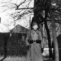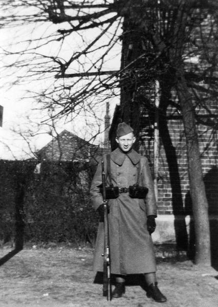 Soldaat Gerrit de Rouw op wacht bij de barricades aan de spoorwegovergang Keulseweg. Op de achtergrond de bakkerij en kolenschuur van de Coöperatie.