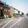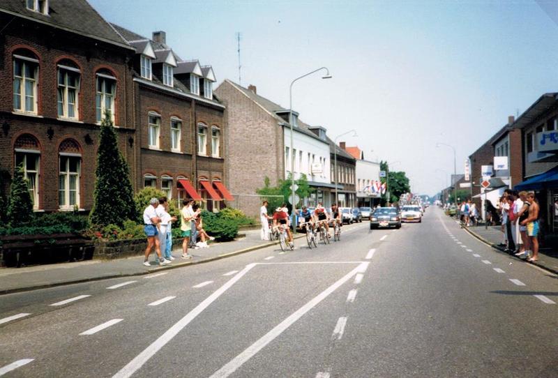 Olympia's ronde doet in 1989 Reuver aan. Op de foto rijdt een kopgroep van zes man over de Rijksweg Reuver binnen.