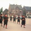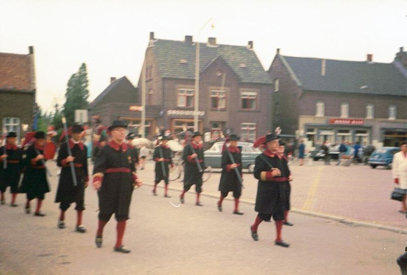 De Schutterij Broederschap St. Georgius & St. Sebastianus uit Beesel trekt in vol ornaat door de straten van Reuver. Op de achtergrond de winkel Van Gassel-Goossens, café Cremers en het oud patronaat.