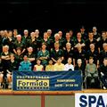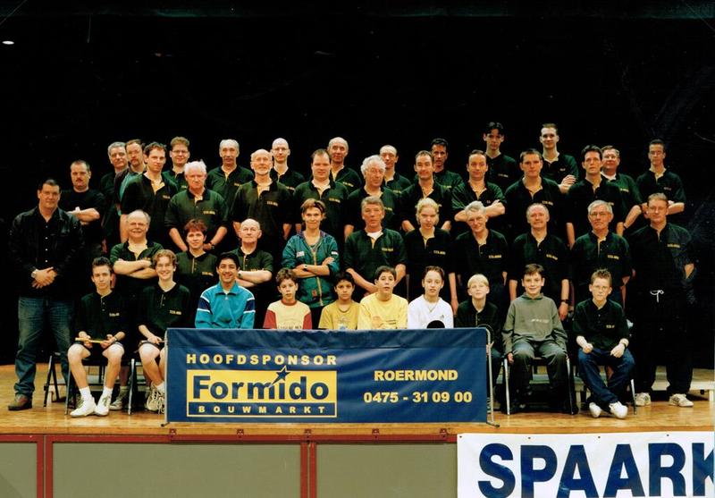 Groepsfoto van de leden van tafeltennisvereniging T.T.V. NOAD, die door de Formido Bouwmarkt een nieuwe outfit geschonken kregen.