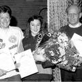 Sportpersoon achter de schermen Mevr. P. Schoute-Gommans van V.V. Reuver, sportvrouw van het jaar Janneke van Herten van S.V. Hercules '03 en sportman van het jaar Lei Schrijvers van V.V. Reuver gezamenlijk op de foto.