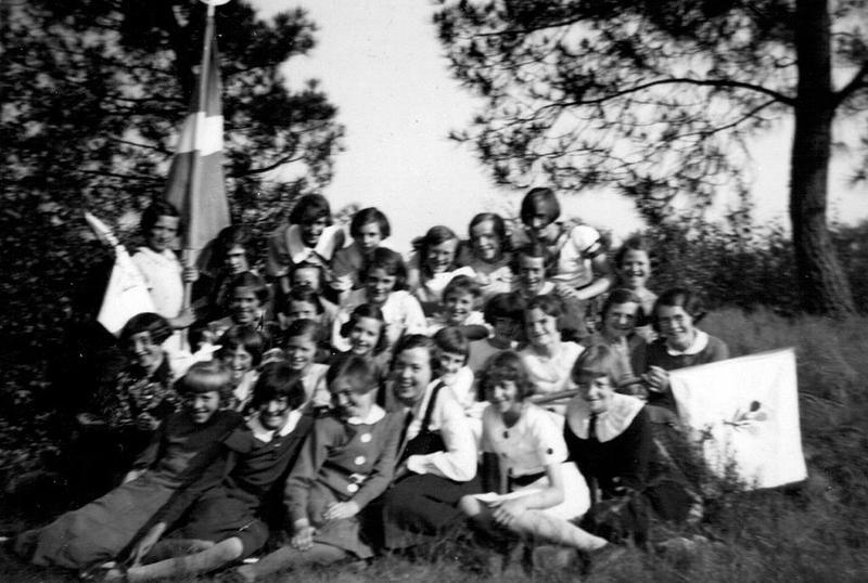 Een groep van het Katholieke Jonge Meisjes gilde gezellig bijeen, compleet met hun vaandel.