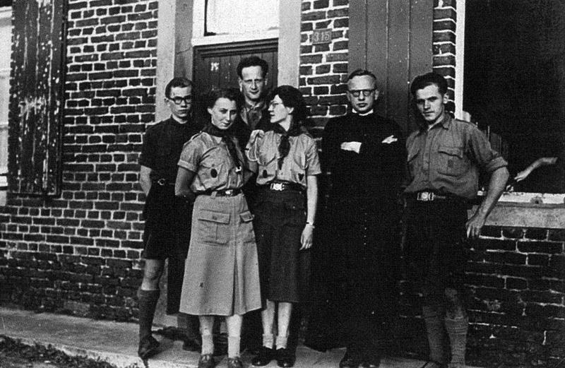 De staf van de verkennersgroep Sint Lambertus uit Reuver begin jaren vijftig.