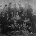 Links met x is Lei Schrijvers en rechts (met sik) is Herman Bors. Langs Herman Bors staat Piet of Peter Jan Heines (met hoge hoed).