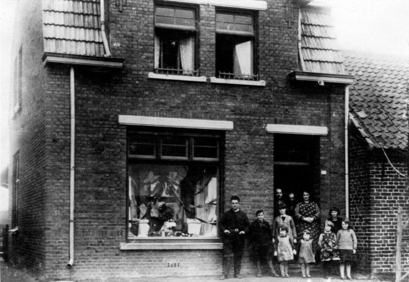 Op de foto staat Willem Goertz (kleermaker) met zijn echtgenote en in hun midden opa in de deuropening. Beneden staan hun kinderen : Joep, Hans, Fien, Gerda, Annie, Lena, Trien en Mia.