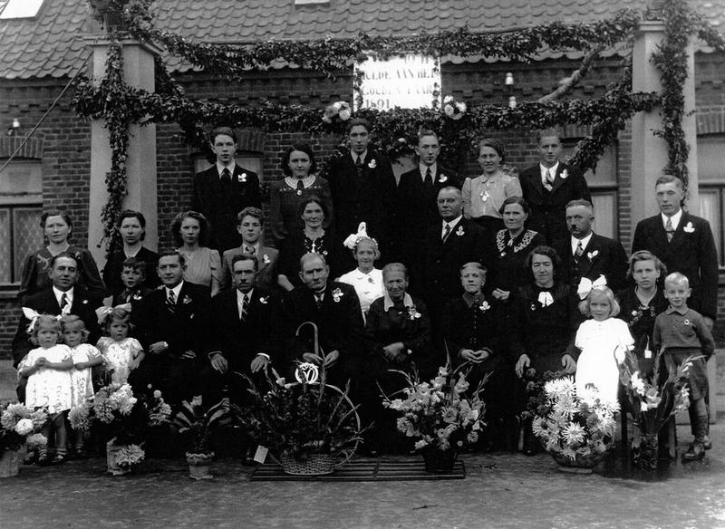 Groepsfoto tijdens de gouden bruiloft van opa en oma Theunissen. Links op de foto staat Koesse Lei met zijn drieling.