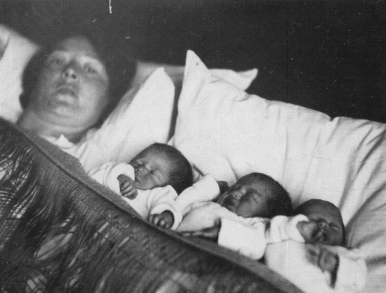De trotse moeder Marie Theunissen - Wilms (van Koesse Lei?) met haar drieling, Annie, Truus en Lenie in 1938.
