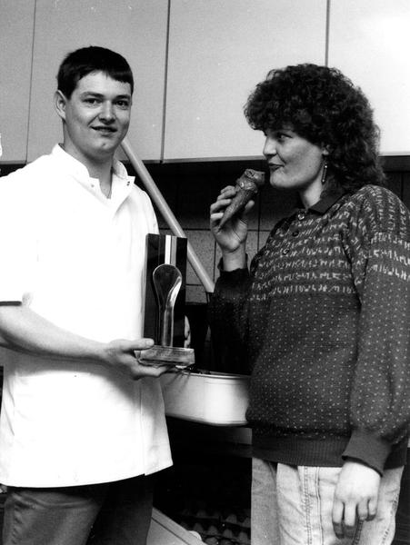 Theo Witjens, samen met zijn vrouw, hoorde tot de drie beste ijsbereiders van het jaar 1988.