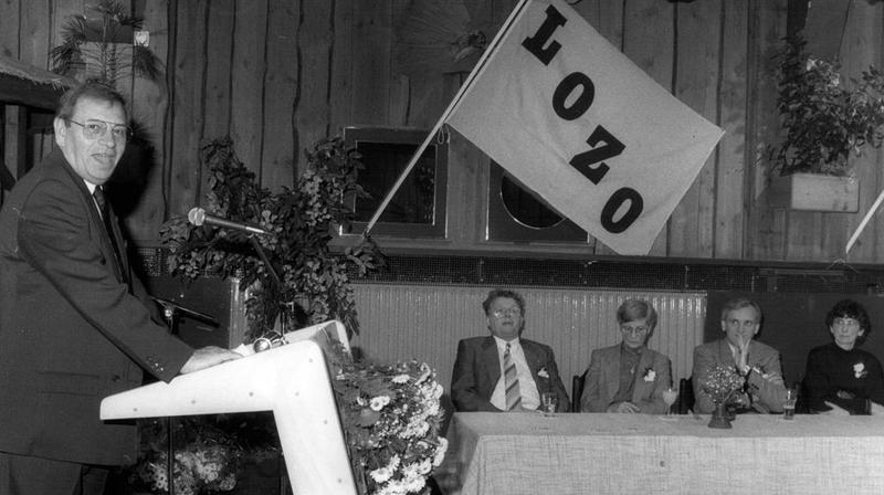 De voorzitter van de LOZO, Oscar Matti, tijdens een toespraak bij een receptie (in de Drakenbôch) van voorzitter Funs Hermansm afdeling Beesel, waarbij de laatste een gouden penning kreeg uitgereikt.