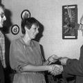 Lozo voorzitter Bert Coenen overhandgt een van de hoofdprijzen aan mevrouw Felten uit Beesel. Links Geerts Göbbels van de N.M.B.