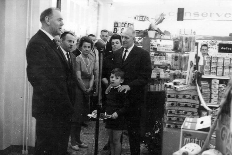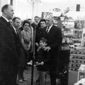 Opening van de eerste Reuverse supermarkt van Teunissen (Baer) aan de Rijksweg. De opening werd verricht door burgemeester Mooren in het bijzijn van de broers Jan en Dré Teunissen.