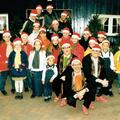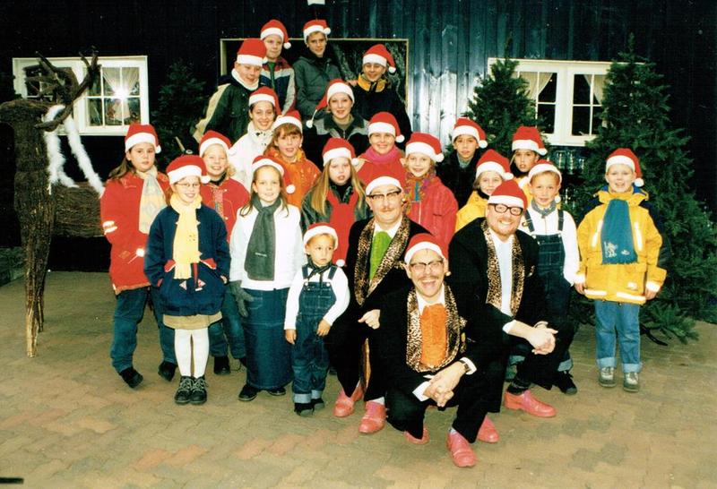 Het trio "De Geraniejums" met het kinderkoor Ringfield uit Belfeld bij hun Kerstproject in 1999.
