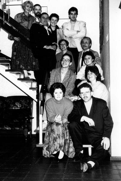 Een aantal leden poseert op de trap voordat ze het door Paul Bloemen vertaalde toneelstuk "Sjlummeriken" (oorspronkelijk "Dwazen" van Neil Simon) op voeren ter ere van het 50 jarige bestaan van de vereniging.