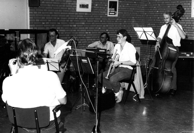 Het Reuvers Revue Orkest tijdens hun repetitie voor de derde Reuverse Revue "Bekiek 't door 'nne sjoëne bril"