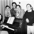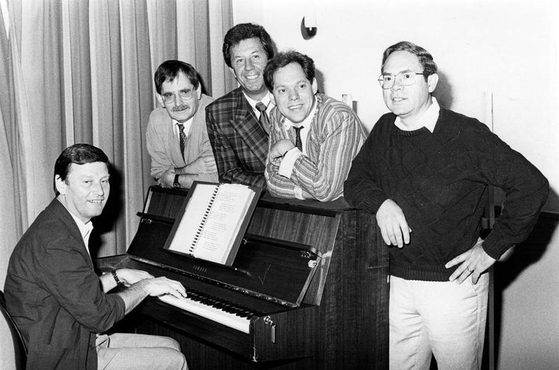Voorbereidingen voor de derde Reuverse Revue "Bekiek 't door 'nne sjoëne bril". Van links naar rechts: Arnold Wassen, Har Geraeds, Jack Pollen, Ger Geerlings en Toon Geerlings.