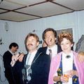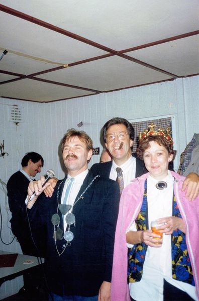 Het gezelschap was op bezoek bij schutterij "Sint Barbara" Op de foto het koningspaar van het Reuvers Revue Gezelschap, Jac Linssen en Inge Geerlings, met in hun midden de beschermheer Jac Pollen.