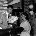 Tijdens de tentoonstelling van Artimosa bood Toos Steeghs-Ickenroth (vrouw van Luc Steeghs) burgemeester Nuytens de bloemen aan na zijn openingstoespraak. Rechts op de foto Artimosa voorzitter Hein Severijns en daarnaast Jaques Janssen.