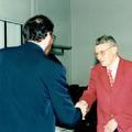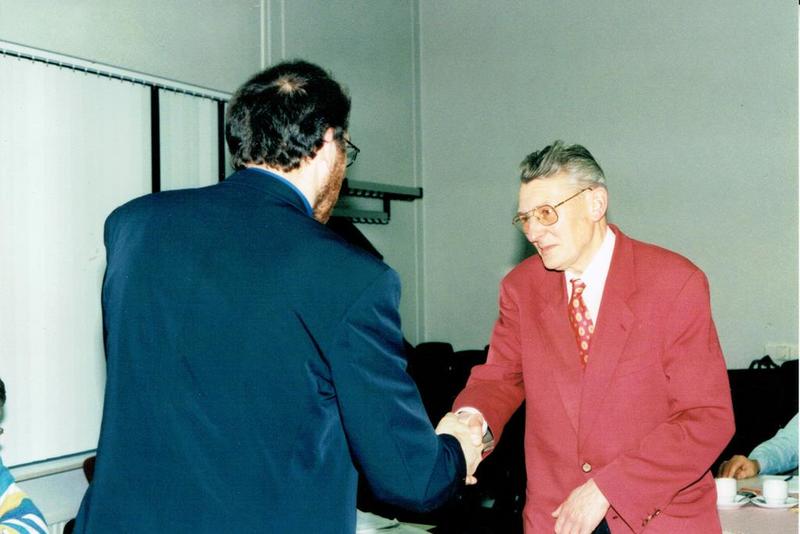 Lei Vaessen (rechst) wordt in 1998 gehuldigd bij zijn 40-jarig lidmaatschap bij tafeltennisvereniging NOAD door voorzitter P. Pubben