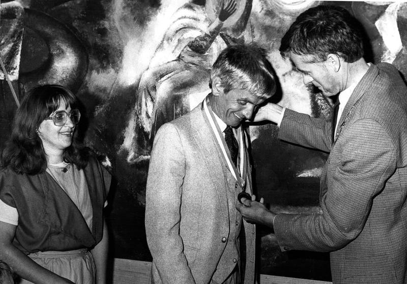 Burgemeester Nuytens bewonderd de gouden medaille die Herman Ravier gewonnen heeft bij de Olympische spelen (zitvolleybal) in New York. Links zijn vrouw Riek Ravier.