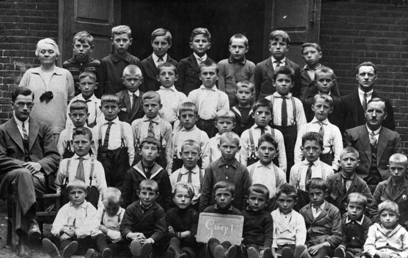 Groepsfoto van een klas van de openbare lagere school uit Belfeld in 1929.