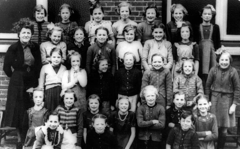 Van links naar rechts, 1ste rij (zittend): Mariet Boonen, An Hoeymakers, An Saris. 2de rij (knielend): Gon v.d. Beuken, An Muysers, Fien Lamers, Mariet Lamers, Jean Lemmen, Mia Jacobs, Nel Janssen. 3de rij: Tiny Seuren, Wies Semts, Jo Hermans, An Dings, Miep Jacobs, Tiny v.d. Biesen, Nel Olders. 4de rij: juffrouw Perey, Tiny Janssen, Sis Midden, Ria v.d. Munckhof, Wilmi Bloemers, Til Derks, Leen Geurts. 5de rij: An van Duren, An Martens, Jean Boots, Ton Wanroy, Alda Jacobs, Truus Gielen, Fien Hovens.