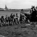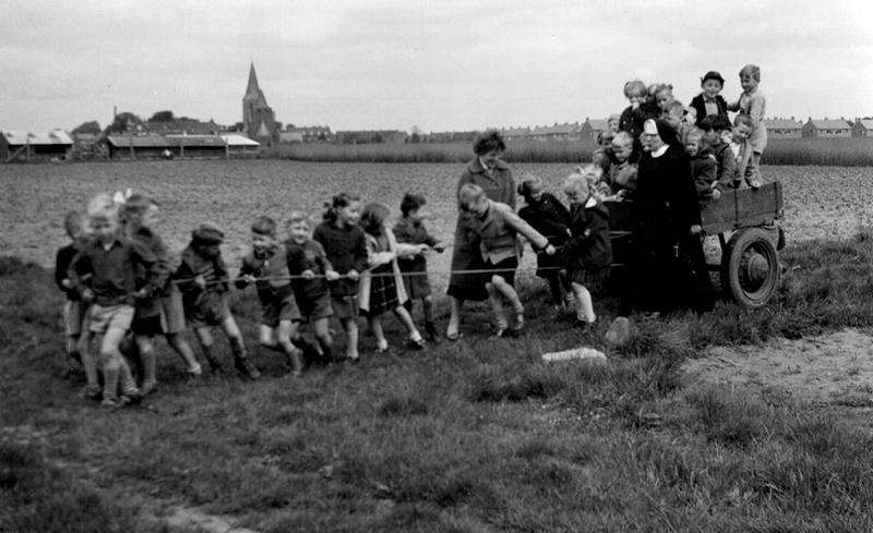 Schoolkinderen trekken de kar door de wei samen met de juffrouw en zuster Myria?.