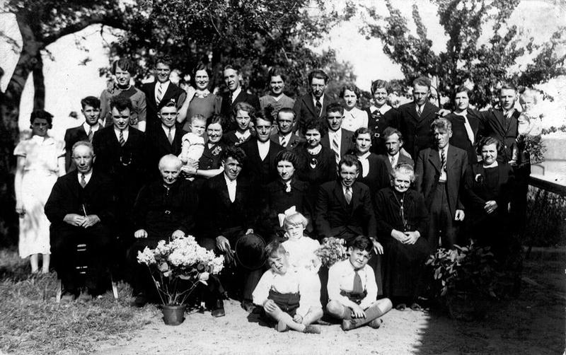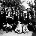 Groepsfoto gemaakt tijdens de bruiloft van Jeu Jacobs en ??.