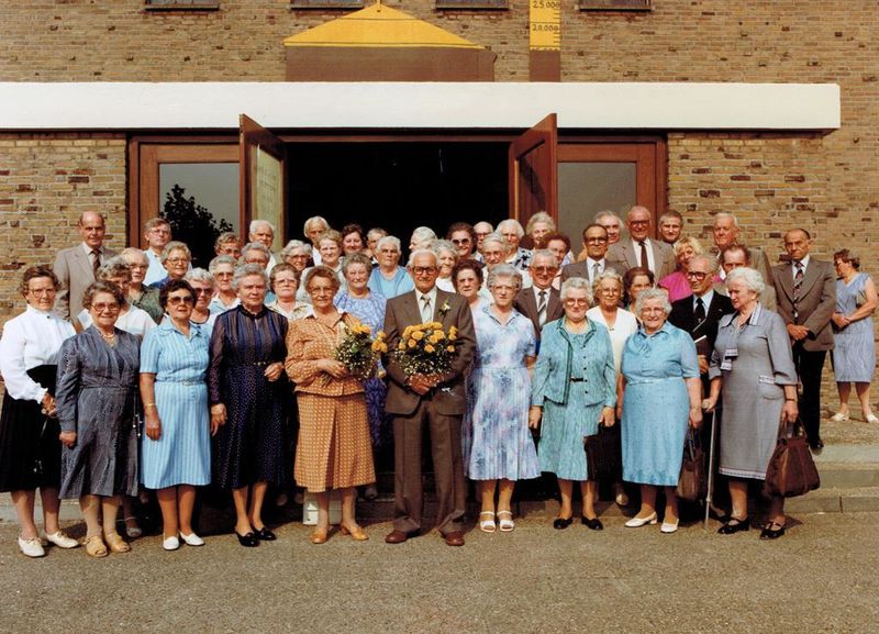 De foto is genomen voor de Fatimakerk in Offenbeek. Van links naar rechts; 1ste rij: 1 Mevr. Geerlings, 2 Mevr. Goertz, 3 Mevr. Gijzen, 4 Mevr. Helwegen, 5 Bobby Helwegen, 6 Mevr. NN, 7 Mevr. Fleuren, 8 Mevr. Houwers, 9 Mevr. van Willick. 2de rij: 1 Mevr. Samang, 2 Mevr. Klerks, 3 Mevr. Barkhof, 4 Mevr. Teunissen, 5 Mevr. Franssen, 6 Mevr. Teunissen, 7 Mevr. Peulen, 8 Dhr. Litjens, 9 Mevr. Schouten, 10 Mevr. NN, 11 Dhr. Naus. 3de rij: 1 Mevr. Hillekens, 2 Mevr. NN, 3 Mevr. Sloezen (staat achter mevr Gijzen), 4 Mevr. Van Gassel, 5 Mevr. v.d Sterren, 6 Mevr. Jacobs, 7 Mevr. Martens, 8 Mevr. Schrijvers, 9 Mevr. Gubbels, 10 Dhr. Vullers, 11 Dhr. Vullers, 12 Mevr. NN, 13 Dhr Dingemans. 4de rij: 1 Wiel Sloezen, 2 Wiel Klerks, 3 Mevr. Huibers, 4 Dhr. Lenssen, 5 Dhr. Niessen, 6 Mevr. Dingemans, 7 v. Soest, 8 Mevr. Weiers, 9 Mevr. Ramakers, 10 Dhr. Peters, 11 Mevr. Vaessen, 12 Mevr. Vincent, 13 Dhr. Derks, 14 Leon Schrijvers, 15 Dhr. v.d. Geijn, 16 Dhr Hillekens, 17 Mevr. van Maris.