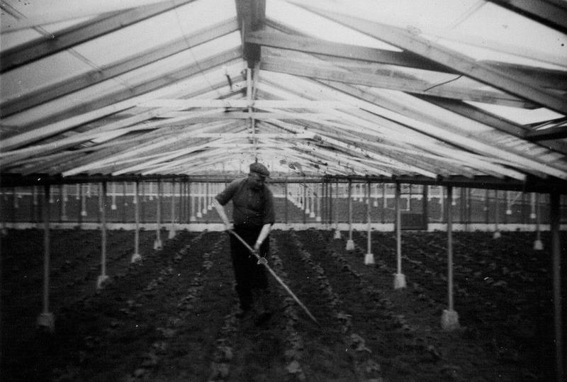 Een man bezig met het schoffelen tussen de slaplanten in een kas.