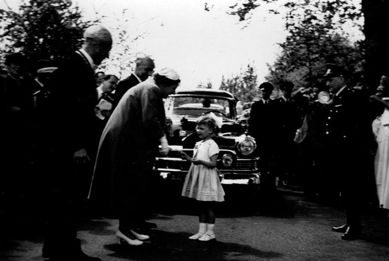 Op 14 mei 1956 was koningin Juliana op bezoek in Reuver. De koningin bracht onder andere een bezoek aan de nieuwe huishoudschool. Henriette Meusen staat klaar om de koningin een bos bloemen aan te bieden. Links staat burgemeester Claessen en rechts gouverneur Houben.
