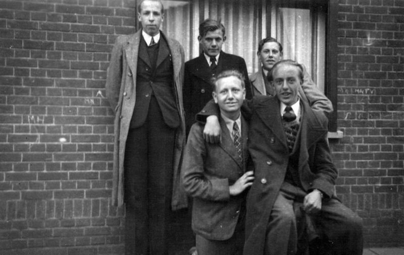 Achterste rij: Jeu Huijbers (van de wasserij) , Jeu Schoolmeesters en Jo Gommans. Voorste rij: Henk Simons en Lam Muisers.