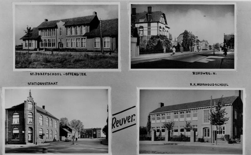 Prentbriefkaart met diverse gebouwen en wegen in Reuver.